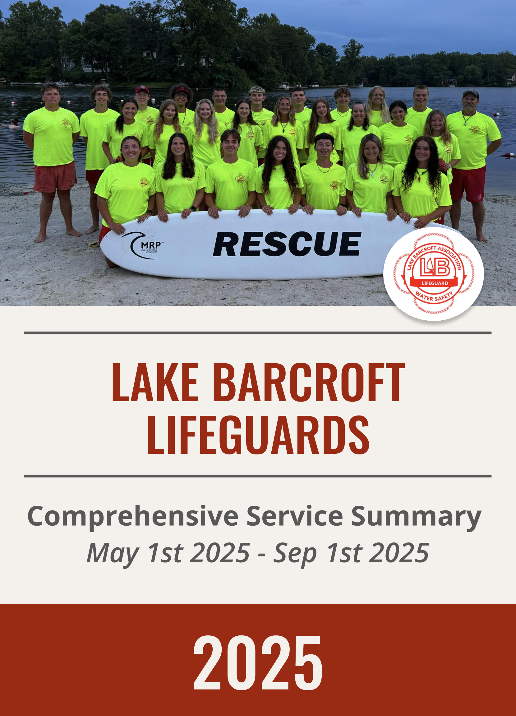 The 2025 Watchtower Summary Report provides a comprehensive review of all Lake Barcroft Association safety and operations activity from May 1 to September 1, 2025. A total of 695 incidents and 488 calls for service were recorded across all beaches and patrol divisions.